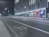 the empty city road is empty by the tall building in the background at night with light streaking on the buildings