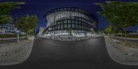 A stunning view of a modern architecture building in Berlin, Germany. The glass roof glows under the artificial light at night, adding to the city's vibrant atmosphere. A perfect blend of urban design and contemporary infrastructure.