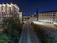 a night time shot of the tracks going past a building complex with other buildings and roads