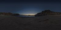 a picture taken with the 360 - angle lens at night of a scenic view of cliffs near a sea
