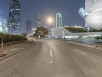 A night view of Dallas's modern architecture. The straight road leads to the bustling business district and is lined with skyscrapers. Streetlights illuminate the dark urban landscape, creating a stunning cityscape.