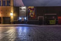Night View of Empty Brick Street with Posters in Dark, Detroit, Michigan, USA