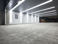 This stock photo features a low angle view of an empty parking lot in Los Angeles, California, USA. The photo is taken at night with artificial lights illuminating the concrete surface. The parking lot is surrounded by a concrete wall on one side and several floors of a building on the other side. The minimalistic design of the parking lot, with its clean lines and tiled flooring, creates a modern and urban atmosphere. The neon lights add a vibrant touch to the dark surroundings. The image captures the metropolitan area of Los Angeles, showcasing the architectural beauty and urban landscape of the city.