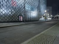 This stock photo features a stunning night view of Berlin, Germany, showcasing its modern architecture. The city lights illuminate the concrete and asphalt roads, creating a captivating scene. In the foreground, a tree-lined road leads to a futuristic office building, surrounded by a line of walls and street lights. The artfully lit infrastructure reflects the urban atmosphere of Berlin, a bustling metropolitan area in Europe's business district. The image encapsulates the city's dark, yet vibrant ambiance, highlighted by the iconic landmark - Futurium.