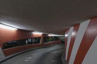 This stock photo shows a night view of the city architecture in San Francisco, California, USA. The image captures a concrete road with bright lights, reflecting off the wall and creating a beautiful line of light. The infrastructure includes a fixed link tunnel, with cars parked in a parking garage. The metropolitan area is depicted with public transportation, including a red subway and motor vehicles driving on the road surface. The urban scene showcases the rugged ceiling of the tunnel, as well as various entry and exit points like highway ramps, driveways, and slopes. The photo provides a stunning portrayal of the bustling city of San Francisco and its impressive infrastructure.