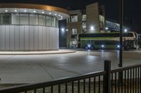 This image captures the vibrant city life of Toronto, Canada at night. The modern architecture and mixed-use buildings create a stunning urban landscape. The open spaces are illuminated by street lights and the artificial light emanating from the office buildings and warehouses. A bus is stopped at a bus stop, with lights on its roof, adding to the electrifying atmosphere. The concrete surfaces and infrastructure of the city are contrasted with the dark night sky. This photo showcases the dynamic urban design and the energy of Toronto's metropolitan area.