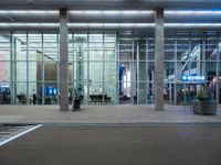 This image captures an empty parking lot at an airport terminal in Holland, Netherlands. The modern architecture of the building is characterized by glass walls on both sides, providing a view of the surrounding city. The scene is illuminated by artificial light, creating a unique atmosphere in the dark night. The metropolitan area showcases the urban design and architecture of Europe. This photo represents the business district and city life in Holland.