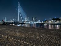 This is an image of a modern architecture in the city of Amsterdam, Netherlands. The photo was taken at night, capturing the beautiful combination of artificial lights on the buildings and street lights. The cityscape is reflected on the surface of the nearby lake, creating a stunning view. The clear sky and the high-rise buildings on the horizon add to the urban design of the city. This image represents the vibrant city life and the unique architecture of Amsterdam, a must-see destination in Europe.