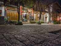 A charming old town in Yunnan, China, with cobblestone roads and low-rise residential buildings. The historic architecture and classic urban design create a romantic atmosphere at night, illuminated by artificial lights. Tourists can explore the village's shops, hotels, and restaurants, immersing themselves in Chinese culture and city life.