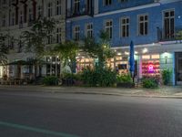 Nighttime in Berlin, a classic European city with dark streets illuminated by artificial light. Residential homes and storefronts line the road, showcasing urban design and architecture. City life thrives with cafes, bars, and shops.