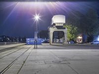 This is an image of a cityscape at night in Berlin, Germany. The photo showcases the urban landscape with buildings, roads, and open spaces illuminated by various lights. In the foreground, the asphalt road and cobblestone thoroughfare lead to the pier and harbor area. The image captures the industrial side of the city with factories, warehouses, and cranes. In the distance, a tower stands tall against the dark night sky. This photo captures the unique blend of history and modernity that Berlin represents in Europe.