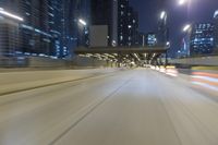 Nighttime view of Chicago, Illinois, with light traffic on the city's highways. The motion-blur effect captures the fast-paced energy of the bustling metropolitan area. Artificial lights and streaks of light illuminate the concrete streets and buildings.