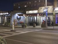 a street corner at night with an advertisement for a bar and cafe on it's sidewalk