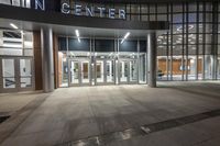 This image captures the modern architecture of a mixed-use office building in the bustling city of East Tennessean, Tennessee. The concrete facade features a large entrance and glass surfaces that reflect the vibrant city life. The contemporary design of the building stands out in the business district, with its sleek aluminum fixtures and composite material flooring. At night, the building's lobby and surrounding areas are illuminated, creating a dynamic and inviting atmosphere. This photo showcases the urban design and innovative urban landscape of East Tennessean.