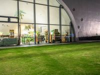 This image captures the vibrant city life in Taiwan, specifically in Taichung and Taipei. The modern architecture and urban design are illuminated by artificial lights, creating a captivating nighttime scene. In the foreground, a large open grassy lawn adds a touch of nature to the cityscape. The glass doors of the storefronts and theater entrance reflect the surrounding lights, adding to the dynamic atmosphere. This photo showcases the energy and modernity of Taiwan's thriving urban centers.