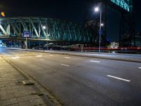 A nighttime view of a pier in Holland, Netherlands. The city lights illuminate the classic architecture and road. The underpass and streetlights create an urban design along the river.