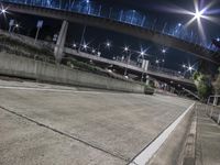 A view of a city street at night, illuminated by street lights and artificial light. The asphalt road surface contrasts with the dark sky. Trees and vegetation add to the urban design.