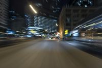 This stock photo features a blurry photograph of a city street at night. The image captures the bustling city life of Chicago, Illinois, USA. The modern architecture and straight road create a sense of urban design in this metropolitan area. Cars can be seen streaking by on the asphalt road, their yellow lights creating vibrant light streaks. Artificial street lights illuminate the dark city, adding to the overall atmosphere. This image represents the fast-paced city life and the movement of people and vehicles in a concrete jungle.