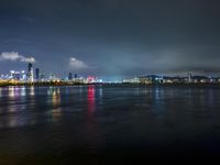 This stunning stock photo captures the vibrant city of Shenzhen, China, as it shimmers with artificial lights under the night sky. The city is situated on the waterfront, with lights reflecting in the calm waters and clouds adding a touch of atmosphere to the scene. The coastal location enhances the beauty of the cityscape, with the horizon blending seamlessly with the dark ocean. Shenzhen, located in the Guangdong province of China, is a major metropolitan area in Asia known for its modern skyline. This image showcases the serene beauty of the city at night.
