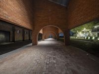 This is an image of a city street in China, specifically in Shanghai, Suzhou, or Hangzhou. The photo captures the essence of city life with its classic architecture, brick walls, and cobblestone walkways. The buildings in the background showcase a mix of industrial and classic architectural styles, with warehouses and factories contributing to the urban landscape. The artificial light illuminates the scene, casting a warm glow on the concrete surfaces and brickwork. This image represents the urban design and infrastructure of these Chinese cities, capturing the energy and charm of the art districts.