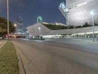 An empty street in Dallas's business district at night, lined with modern office buildings and illuminated by street lamps. The clear sky adds a touch of brightness to the urban landscape.
