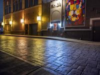 This is an image of a city street at night in Detroit, Michigan, USA. The classic architecture of the buildings is illuminated by artificial lighting, including street lights and neon signs. The facades of the buildings feature windows, walls, and flooring, providing a reflection of the neon lights. The road surface is made of cobblestone and graffiti adorns a nearby wall. The overall atmosphere is urban and vibrant, with the colors and lights creating a dynamic scene. This photo captures the essence of nightlife and the unique charm of Detroit's architecture.