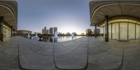 a fish eye lens view of a fountain and buildings with a person walking in the distance