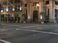 This image captures the vibrant cityscape of Los Angeles, California, USA at night. The classic architecture of the buildings is illuminated by artificial street lights, creating a dynamic atmosphere. Pedestrians can be seen crossing the street at the crosswalk, adding movement to the scene. The road surface, made of asphalt, reflects the glow of the lights, adding depth to the composition. This photo depicts the bustling nightlife of a popular neighborhood in Los Angeles, where people can enjoy dining at the many restaurants and bars in the area.