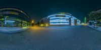 A snapshot of a modern cityscape in Los Angeles at night. The image captures the reflection of the city lights on the glass buildings and the straight road ahead. The fish eye lens creates a unique perspective, giving a 360-degree view of the urban landscape.