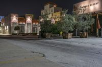 This is an image of a suburban neighborhood in Los Angeles, California, USA. The photo was taken at night, showcasing the low residential buildings and streets illuminated by street lights. The classic architecture of the cafes, restaurants, and art district adds to the charm of this urban area. The photo captures the vibrant city life and the artificial light that brings the town to life after dark. It represents the entry to a lively neighborhood where residents and visitors can eat out and enjoy the cultural scene.