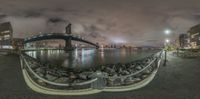 the view looking out towards a bridge over water at night time, surrounded by rocks and large buildings