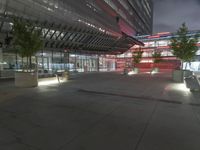 Aerial view of a metropolitan area at night, with illuminated buildings, roads, and open spaces. The concrete structures and asphalt roads create a modern facade. The artificial light gives the city a vibrant feel.