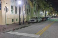 This is an image of a suburban neighborhood street in Miami, Florida at night. The road is illuminated by street lights, casting a yellow light on the asphalt. The residential area is lined with houses and there is a crosswalk visible on the street. A mid-size car is parked next to the curb. The urban infrastructure, including the street lights and the road itself, reflects the artificial light of the city at night. This photo represents the nighttime atmosphere of a neighborhood in Miami.