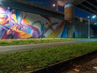 This stunning image captures a mural in a tunnel by the highway at night in Taipei, Taiwan. The mural, painted on a graffiti wall, showcases vibrant graffiti art that adds a pop of color to the dark surroundings. The tunnel is illuminated by street lights, creating a mesmerizing atmosphere. The clear sky above, along with the trees and park nearby, provide a serene backdrop to this urban artwork. This photo beautifully depicts the recreational and artistic side of Taipei, showcasing the vibrant street culture and creativity of the city.