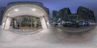 a 360 view mirror shows the street and buildings at night with cars driving through the alley