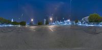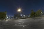 a view from an empty parking lot at night with buildings in the background and lots of light shining