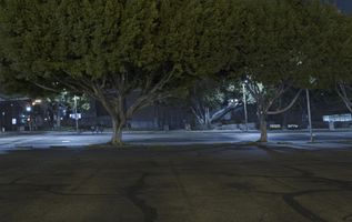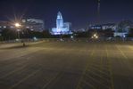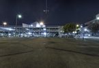 A nighttime view of an empty parking lot in Los Angeles. The modern architecture of the surrounding buildings is illuminated by bright lights, creating a futuristic cityscape. The clear sky contrasts with the dark surroundings.