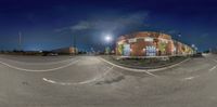 a view of an empty parking lot at night time by some buildings on the street