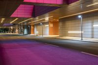 An empty parking space in Shenzhen's vibrant business district at night. Modern architecture and neon lights illuminate the concrete walls. A glimpse into the lively city life of Asia's rising business hub.