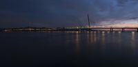 a lighted up bridge over the ocean in the twilight sun sets behind it and lights up on other bridges