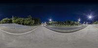 A skateboarder performing a trick at night, illuminated by streetlights and the glow of the city. The straight road surface and elevated concrete street create an urban backdrop for the urban design. The dark night sky contrasts with the bright lights.