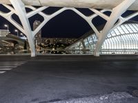 This stock photo features a scenic view of a street with an artistic architectural structure in the City of Arts and Sciences in Valencia, Spain. The image showcases the modern and futuristic architecture of the city, with a bridge and underpass. The street is illuminated by artificial light, with streetlights and a parking garage providing a subtle glow. The beautiful iron and metal arches create a unique profile against the dark night sky. The S-curve of the road adds a dynamic element to the scene. This image captures the blend of urban and recreational spaces in Valencia, making it a perfect addition to any project that requires visuals of modern cityscapes or architectural beauty.