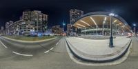 A fish-eye lens captures the vibrant city life of Toronto at night. Futuristic architecture and towering skyscrapers illuminate the cityscape. The street corner is lined with modern buildings and streetlights.