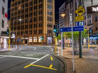 This is an image of an empty street in Wellington, New Zealand at night. The building in the foreground is illuminated with artificial light, showcasing its architectural design. The city's urban landscape is visible, with office buildings and storefronts lining the street. Green traffic lights and signs indicate the absence of traffic. The dark sky adds to the atmosphere of the urban night scene. This photo captures the essence of city life in Wellington, with its bustling business district and well-designed urban environment.