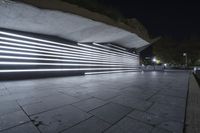 This stock photo showcases the vibrant atmosphere of urban architecture in New York City at night. The image displays a large walkway in front of a building, with neon lights illuminating the scene. The concrete sidewalk and asphalt road surfaces create a modern aesthetic, while the lines and structures add a dynamic touch. The artificial lights cast a captivating glow, emphasizing the city's bustling nightlife. This photo perfectly captures the energy and allure of Manhattan, making it ideal for various projects, such as tourism promotion or architectural design inspiration.