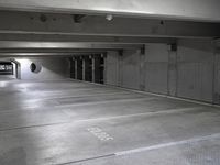 A monochromatic view of a modern architecture in Berlin, Germany. The city's urban design features grey concrete streets and parking decks. The dark night sky contrasts with the parallel lines of the road surface.