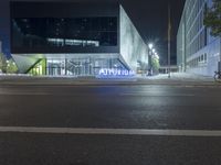 An empty street at night in Berlin, Germany. The modern glass building, with the words 'Mutipin' lit in bright blue, showcases futuristic architecture. The city lights create a dark, urban atmosphere in this bustling business district.