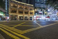 This is an image of a city street in Hong Kong, China. The photo captures the vibrant metropolitan area at night, with classic architecture and street lights illuminating the scene. The road is made of asphalt and there is an open space with a crosswalk in the foreground. In the distance, there are restaurants and bars, creating a lively atmosphere. This image represents the urban transport and nightlife of Hong Kong, a bustling city in Asia.