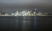 This is an image of the San Francisco cityscape at night. The metropolitan area is illuminated with artificial light, creating a stunning view of the city and its skyline. The coastal city overlooks the ocean, with the dark water reflecting the lights. The grey sky adds to the urban atmosphere. The photo captures the vibrant energy and beauty of the city, with its mix of suburban and residential areas. This stunning image provides an overview of San Francisco, showcasing its open spaces and the river that runs through it.