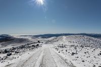 This stunning image captures the beauty of the North Island of New Zealand. The landscape features a low mountain road that leads straight into the rugged terrain. The snowy peaks contrast with the clear blue sky and abundant sunshine. The sun is visible, casting a warm glow on the landscape. This photo showcases the untouched nature and off-road tracks available for exploration. It represents a sunny day in New Zealand, perfect for those seeking adventure and breathtaking views.
